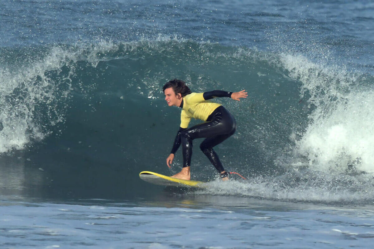 Lo que consiguen los alumnos es ganar un extra de confianza y diversión con poco esfuerzo. Apenas tienes que remar para coger las olas, pues consigues alcanzar la espuma cuando el agua te da por la rodilla. Este arenal tiene una extensión de 500 metros de largo, de los cuales unos metros se limitan con banderas única y exclusivamente para el surf en verano.